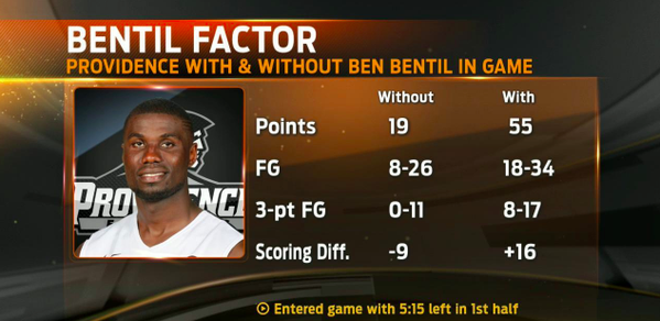 - Ben Bentil, who was suited up for the first half but didn’t come into the game until 5:15 left in the first, changed the entire complexion of the game. The crowd got into it, the other players looked like the pressure was lifted off their shoulders, and the entire team was just more energized just by his mere presence. To look at the difference he makes for this team, just check out this graphic.