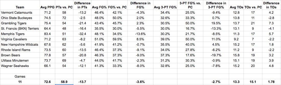 Although a ton of their other team statistics don’t immediately jump out at you, if you look at what the teams playing PC are doing against the Friars compared to their season averages, you’ll see what Providence is really doing to suffocate these teams.